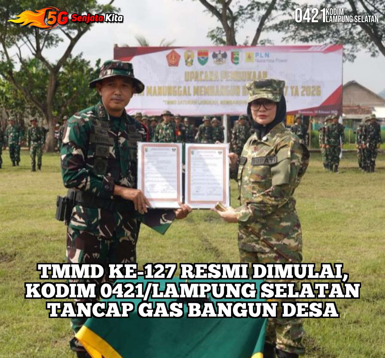 Upacara pembukaan TMMD ke-127 dipimpin oleh Bupati Pesawaran, Ibu Nanda Indira, S.E., M.M., dan dihadiri unsur Forkopimda, jajaran TNI-Polri, perangkat daerah, tokoh masyarakat, serta warga setempat yang tampak antusias menyambut program pembangunan tersebut.