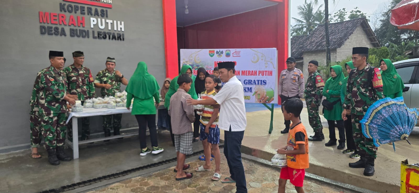 24Detik.com | Tanjung Bintang, Lampung Selatan – Meski diguyur hujan deras, semangat berbagi di bulan suci Ramadhan tidak surut. Anggota Koramil 421-09/Tanjung Bintang bersama Forkopimcam dan Pemerintah Desa Budi Lestari tetap melaksanakan kegiatan pembagian takjil gratis kepada masyarakat di depan Gedung KDKMP Desa Budi Lestari, Kecamatan Tanjung Bintang, Kabupaten Lampung Selatan, Senin (9/3/2026).