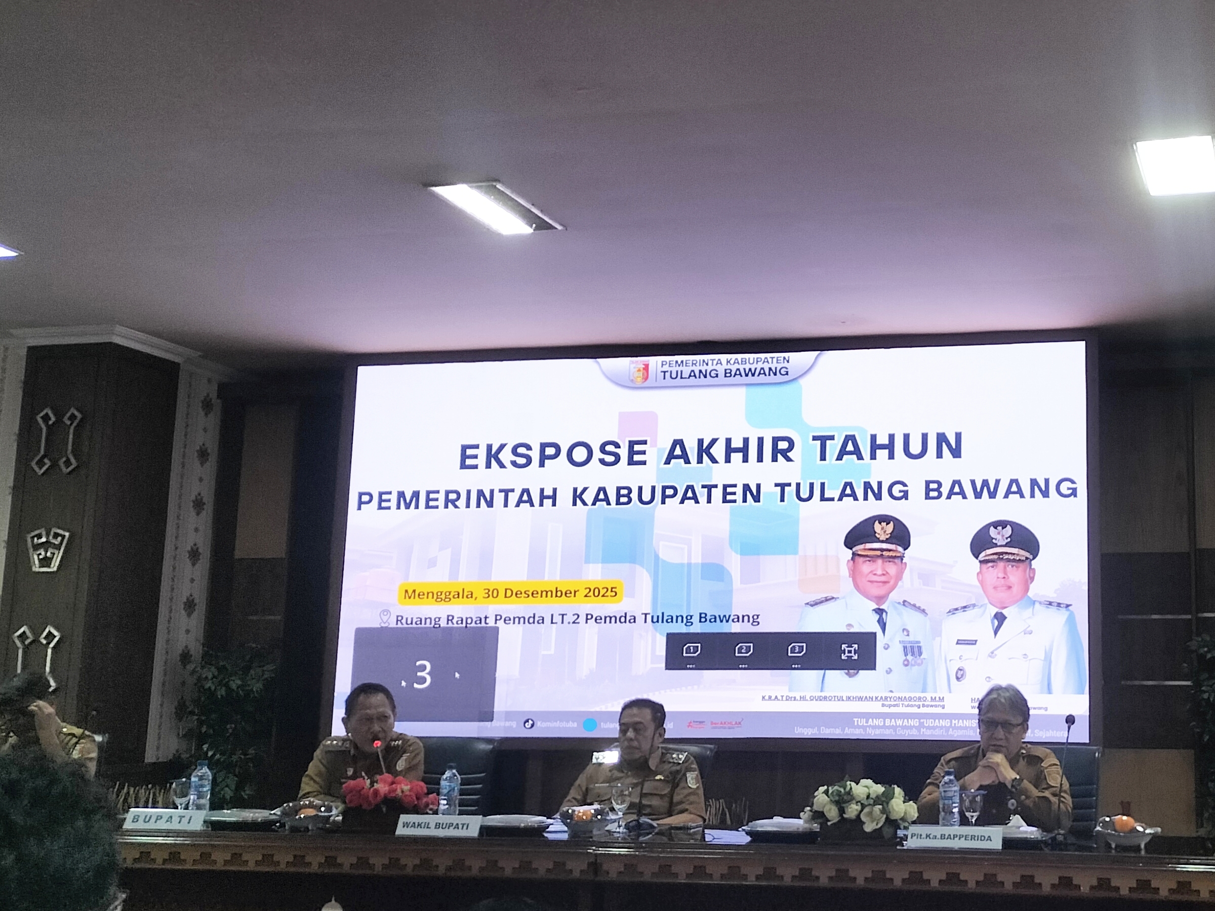 Kegiatan yang digelar di Ruang Rapat Lantai II Pemda Lama, Selasa (30/12/2025) tersebut dihadiri oleh Bupati Tulang Bawang Drs. Qudrotul Ikhwan, MM, Wakil Bupati Hankam Hasan, Pelaksana Tugas (Plt.) Kepala Bapperida, Asisten II Sekretariat Daerah, jajaran Organisasi Perangkat Daerah (OPD), unsur Forkopimda, serta insan pers.