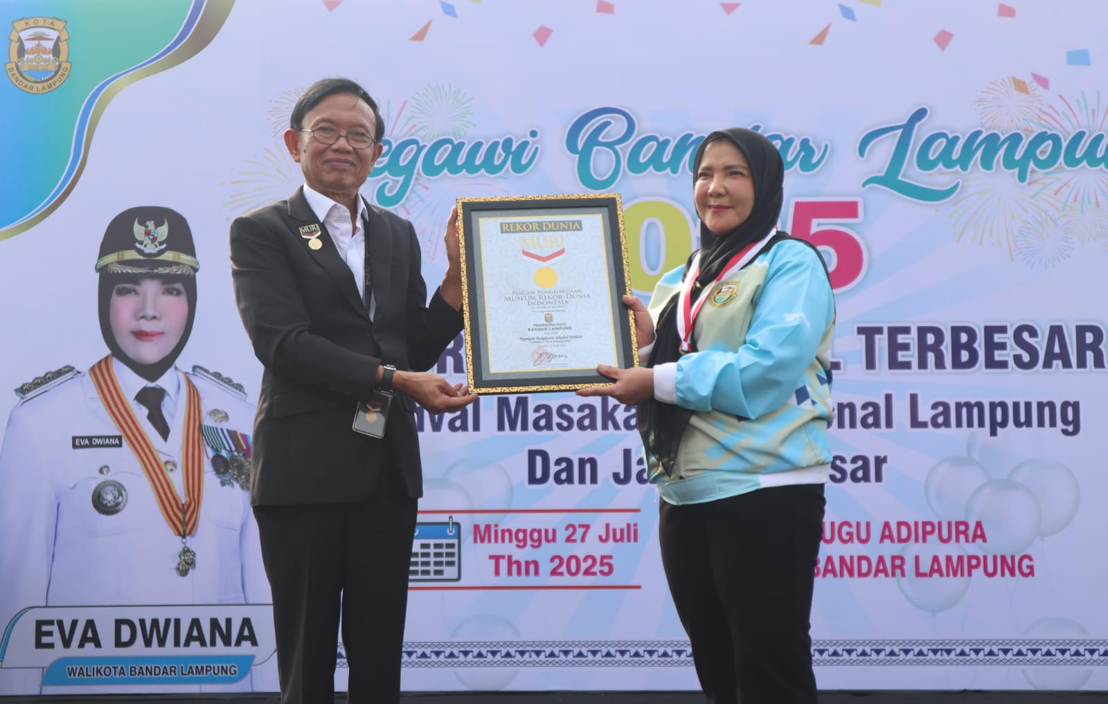 Pemberian penghargaan tersebut diberikan oleh Direktur Operasional MURI Bapak Yusuf Ngadri kepada Wali Kota Bandar Lampung Hj. Eva Dwiana dalam kegiatan Festival Masakan Tradisional Lampung dan Jajanan Pasar di Bandar Lampung.